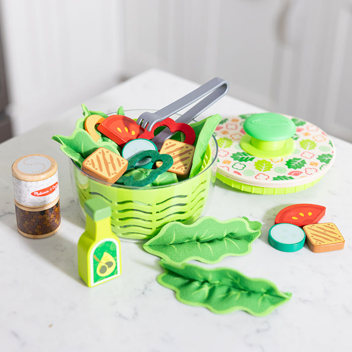 The Salad Spinner provides a fun and healthy way to play! Children can peel off the re-stickable fabric lettuce leaves from a plush core and place them into the spinner. Then, they can press a button to watch the leaves spin. This set is perfect for pretend kitchens and restaurants, encouraging storytelling and both independent and cooperative play. Additionally, it promotes the development of fine motor skills.