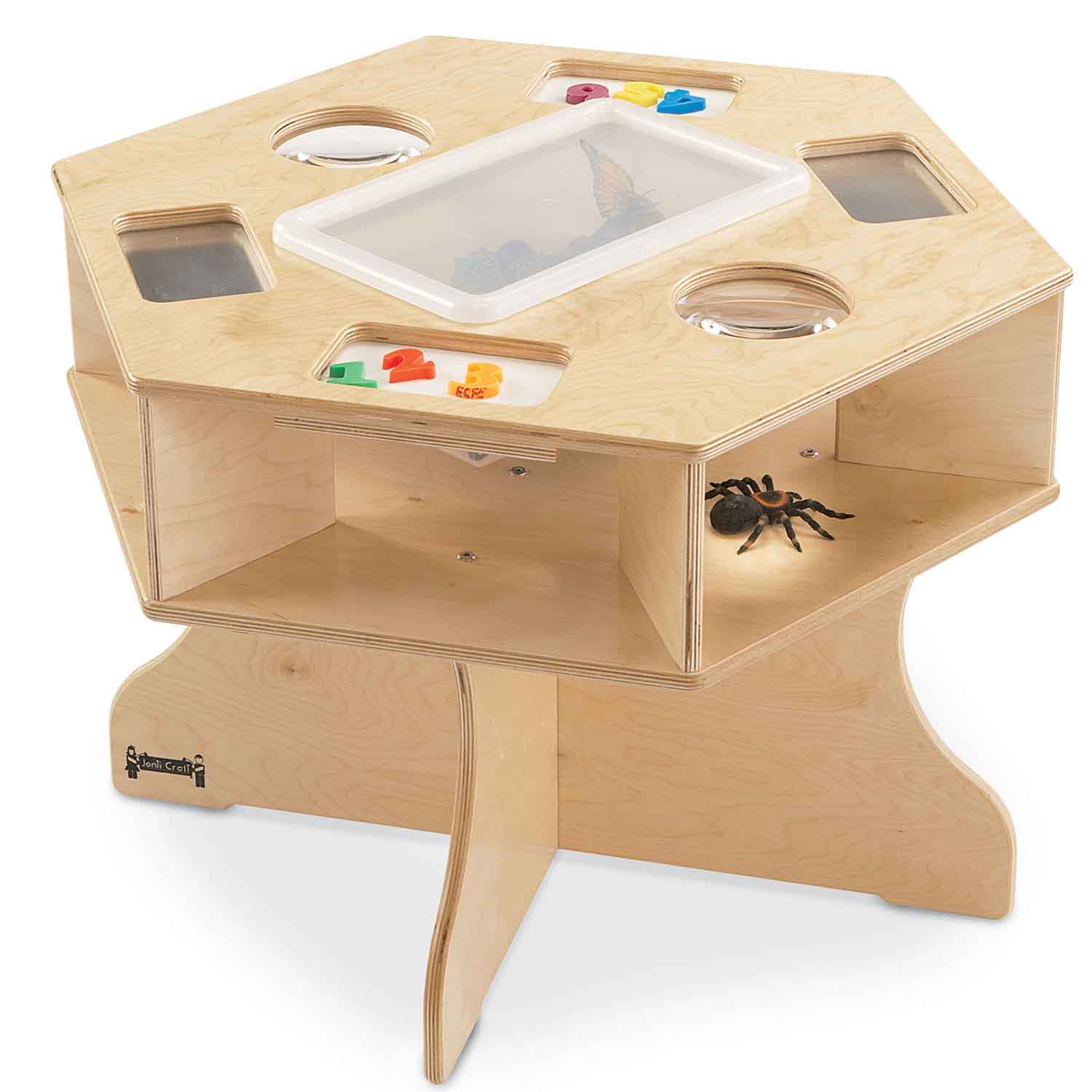 Curious scientists can explore magnets, magnifiers, and mirrors at this six-sided table. Stow supplies in clear cubbie tray-n-lid, included.