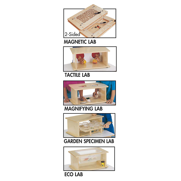 Build and explore with the Science Lab System. All labs store on the cart and are ready-to-use for instant science lessons. Six piece set includes Magnifying Lab, Tactile Lab, Garden Specimen Lab, Eco Lab, and the Science Lab Cart. Stackable.