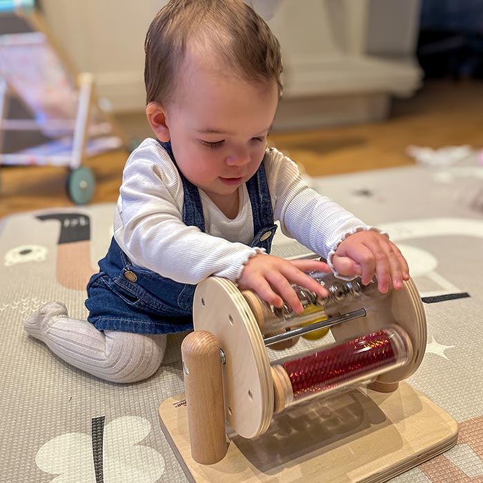 The Sight and Sound Drum supports sensory exploration through spinning motion, varied textures, and engaging sound. Four tubes filled with visually stimulating materials and clacking wooden spheres help develop motor skills, observation, and listening abilities. The spinning motion encourages interaction, supporting early learning and development. Crafted from sustainably sourced wood and safe for early learning environments.
