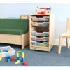 This compact mobile storage cabinet includes six shallow clear storage trays that make storage and organization a snap. The rugged trays are easily removed and replaced after playtime or classroom use. Mounted on casters for handy mobility.