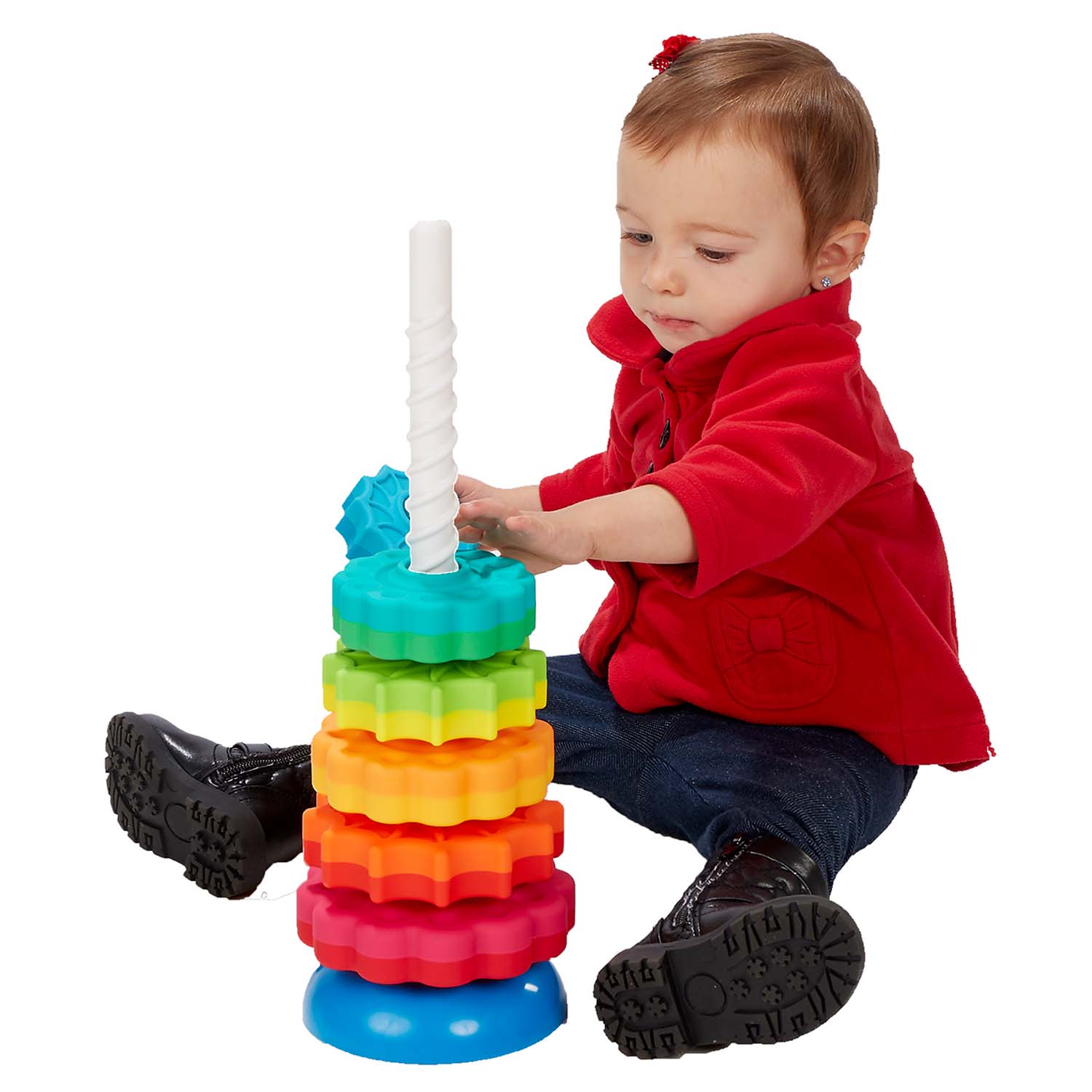 Place the sequentially sizes discs on the corkscrew-shaped rod one at a time and watch with fascination as they spin, twirl, and whirl to the bottom! Each disc is dual-colored, and from largest to smallest, they form a dynamic rainbow utilizing fun shades like magenta, lime, and teal, and your more traditional shades of lemon, red, and sky blue. The star-like discs alternate between daisy style and star-burst shapes, too.