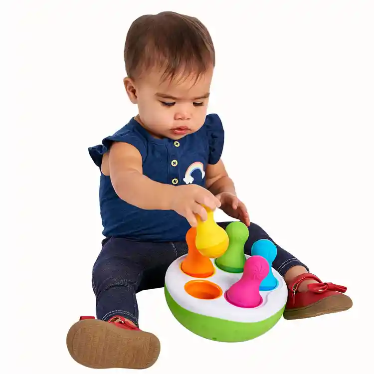 This open-ended, sensory toy uses a wobbly bowl with holes for sorting textured, wobbly pins! This type of activity encourages fine motor skills, sensory exploration and early experimentation. The textured pins fit into bowl either upside down or right side up and the bowl makes a chime sound when wobbling.