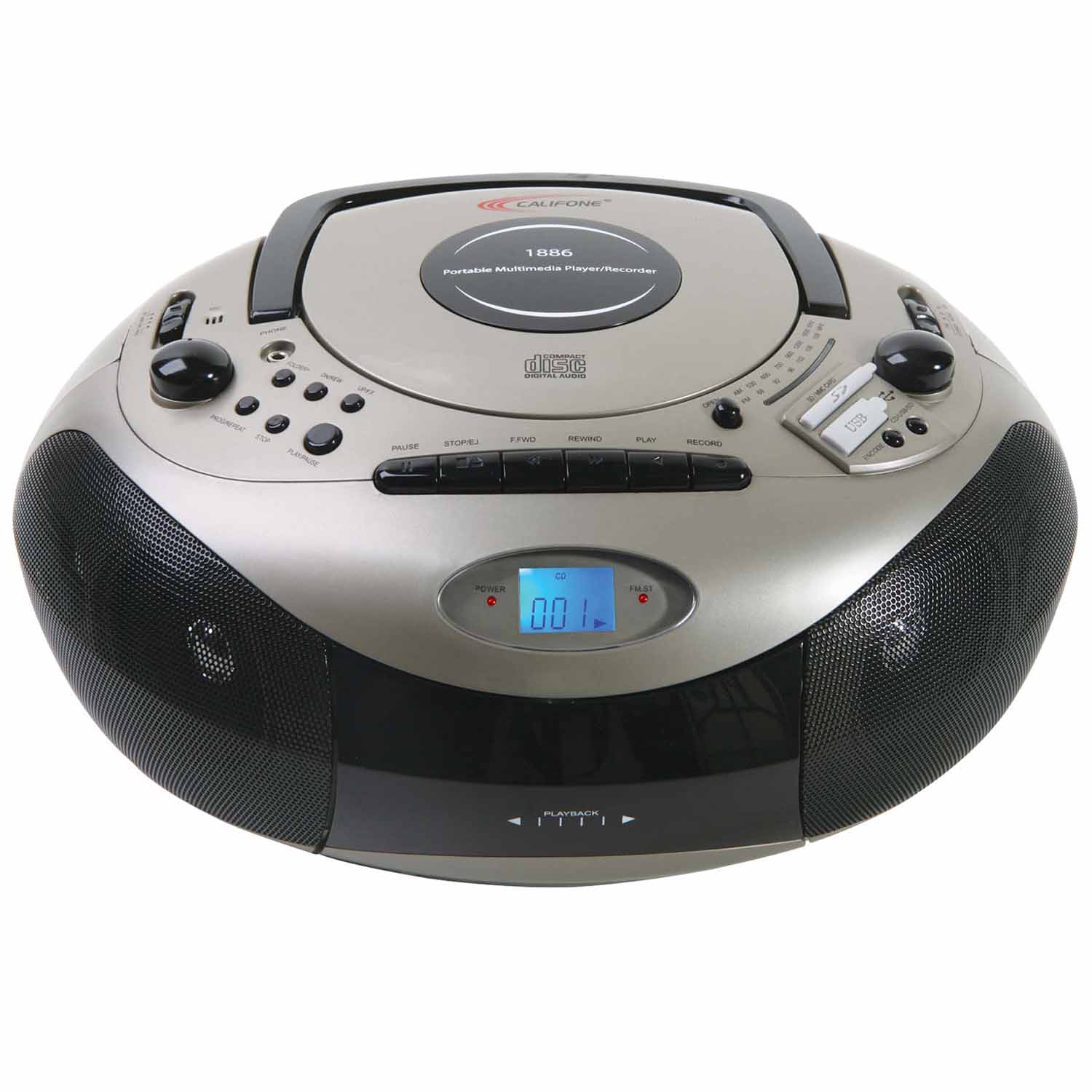 The Spirit SD CD Cassette Player brings new technology to classroom multimedia player/recorders. With its built-in SD card slot and USB port, the Spirit SD is made to work with the latest formats as well as the teacher-tested CD player, cassette recorder/player, & AM-FM radio. Built for high-use environments with shatterproof ABS plastic for durability & safety, it's ideal for group or individual reading activities, literacy, ELD, ESL, and other language learning programs. It features function selector, built-in mic, top loading CD player tailored for school use, band switch, tuning control, SD card slot and USB connector, volume control, steel grills prevent accidental damage to recessed speakers, rugged ABS plastic for safety and durability, and top-mounted 3½mm headphone jack for individual use or to connect a jackbox for group learning.