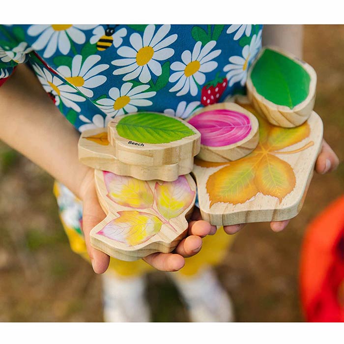 These double-sided, stackable leaf blocks feature leaf shapes with summer illustrations on one side and fall on the other.