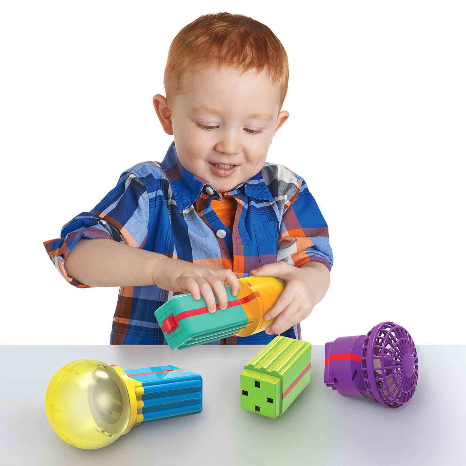 Did you say circuits?! Watch older toddlers connect, click, and flip the switch for some WOW results! They can create either a spinning fan, a glowing light, or a whistling siren. All pieces are interchangeable for fun experimenting. Children will develop an understanding of circuitry and build a strong foundation for future STEM success.