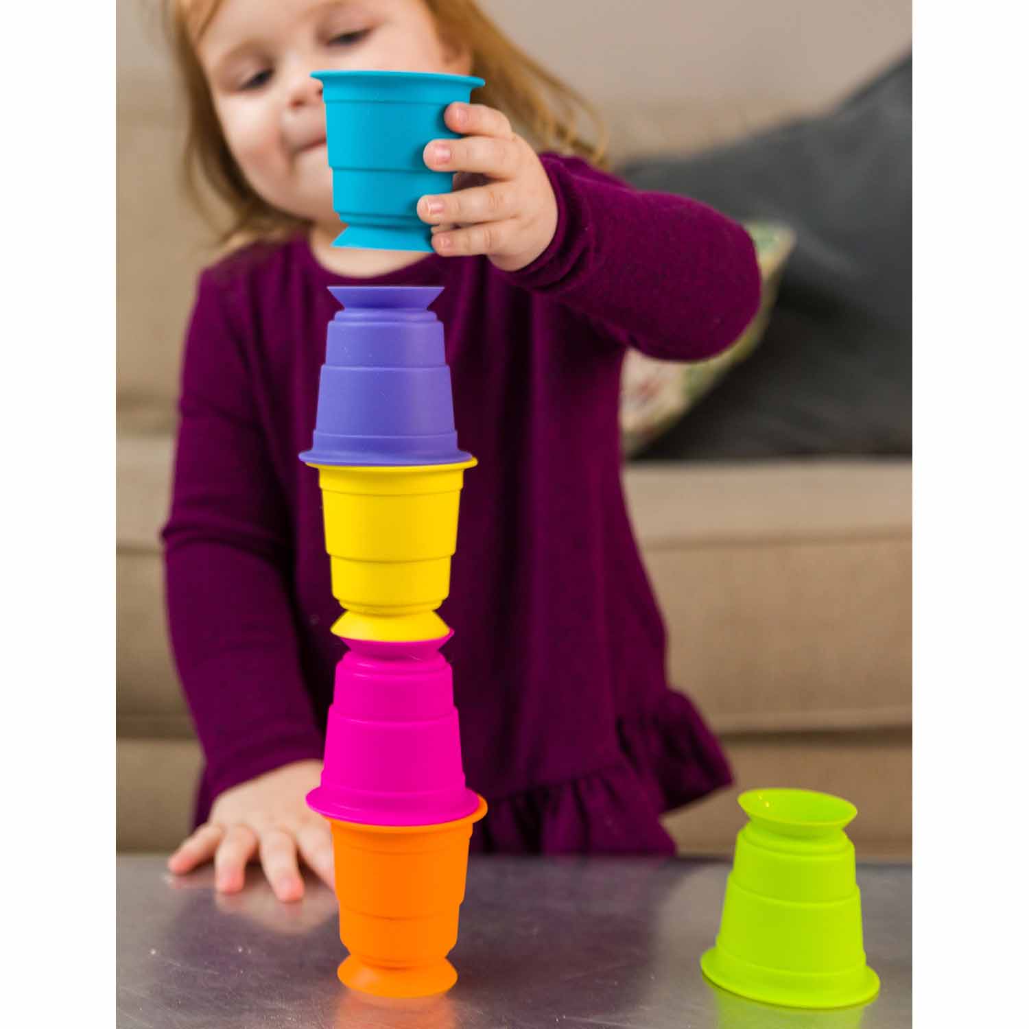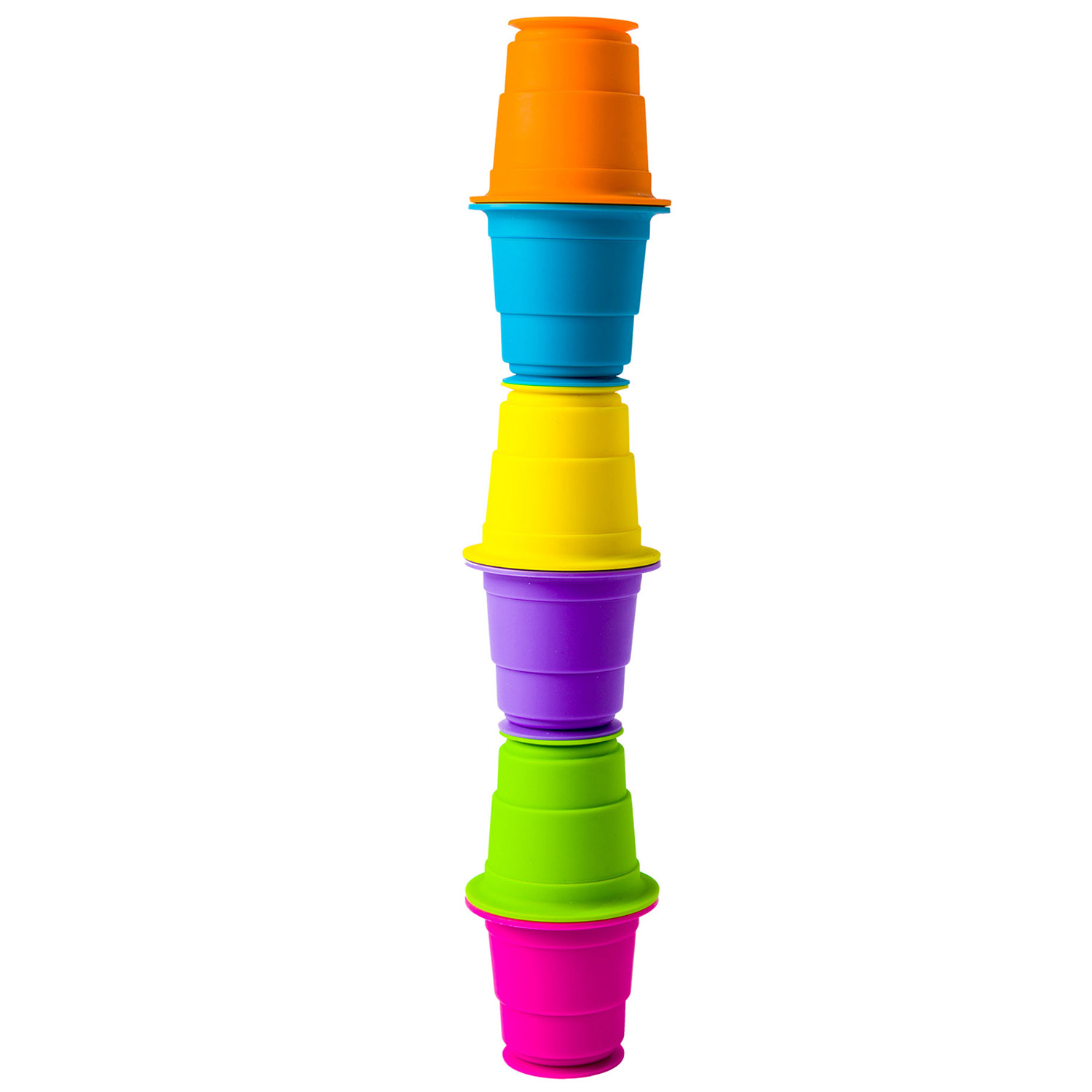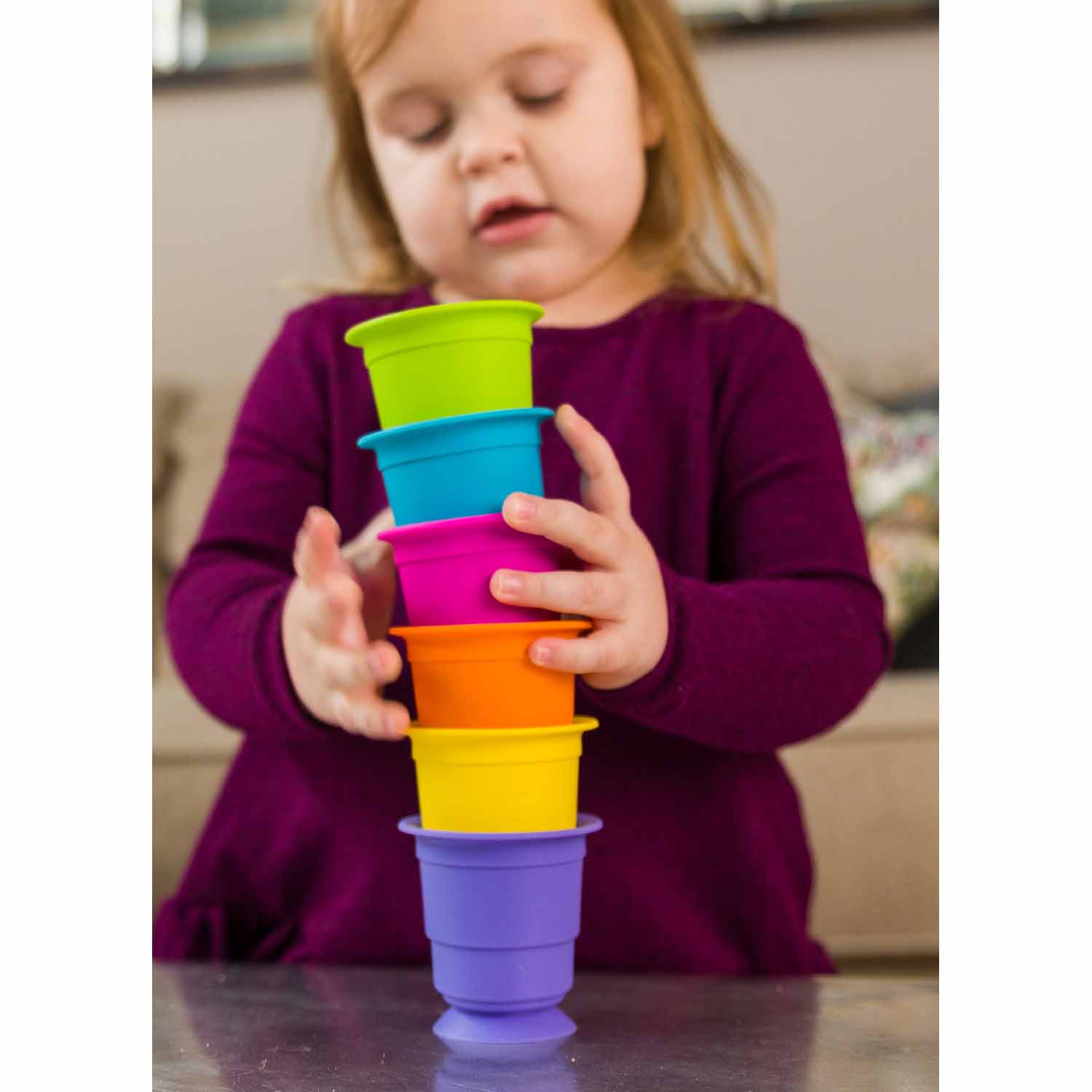 Each of these vibrant, squishy silicone cups features a suction cup bottom plus a suctioning rim at the top. Stack them up tall or flip them on their sides and send them rolling. Stick them to walls, flat surfaces or even each other and then pull them apart to hear them POP. Great for water play, also.