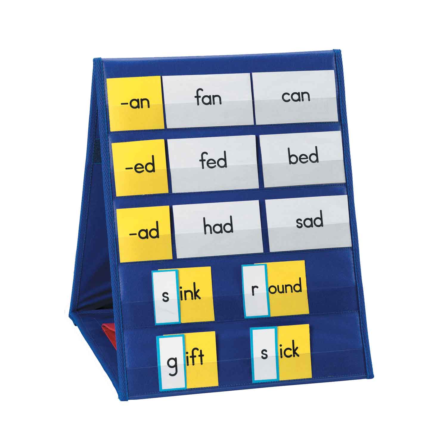 No stand needed with this convenient pocket chart. Just set it up on the table for small group or individual use. The double-sided, easel-style chart supports itself!