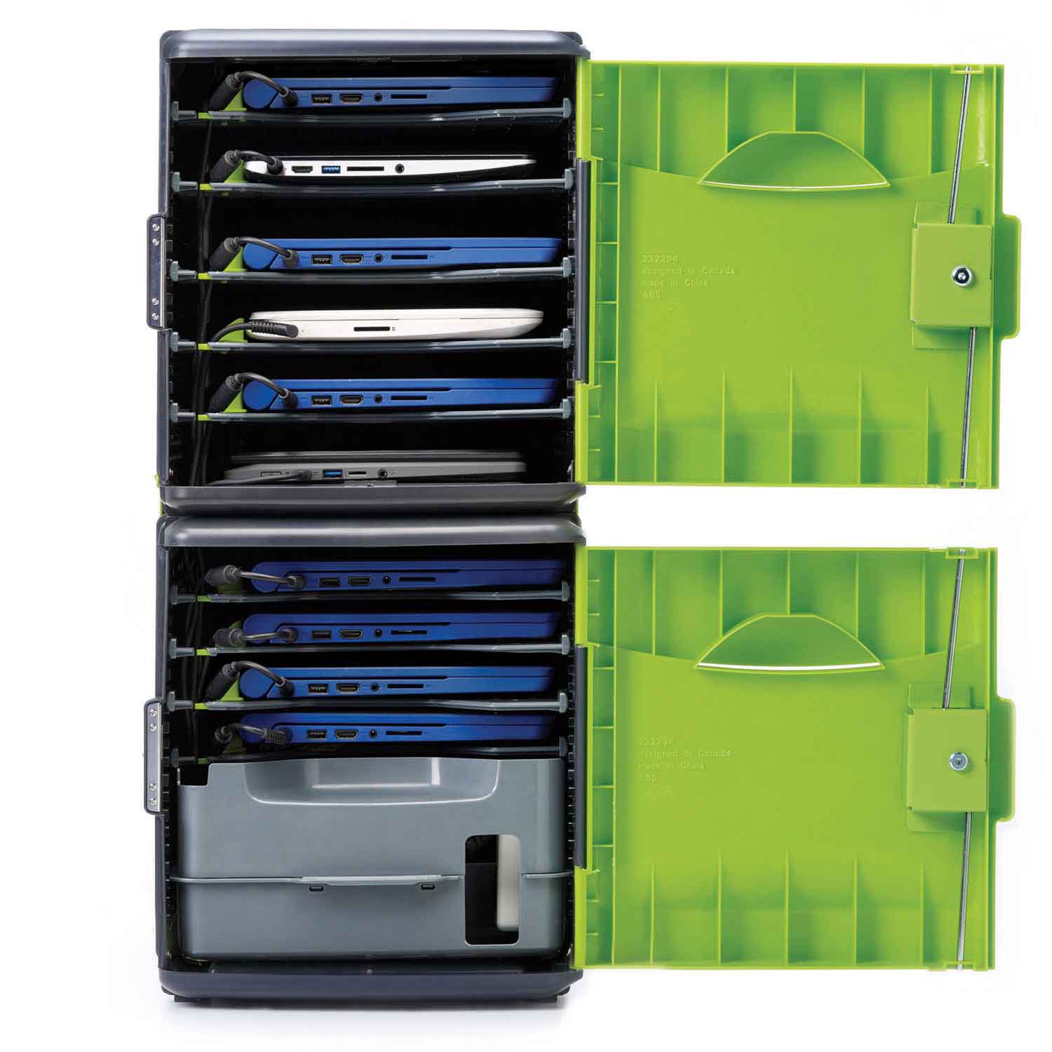 The Tech Tub2® provides a flexible and mobile solution for charging and storing devices used in classrooms. The Tech Tub consists of two tubs permanently connected to make a single unit for 10 Chromebooks or tablets. Includes adjustable shelves to accommodate devices with and without cases. Internal 10-outlet power strip with surge protection.