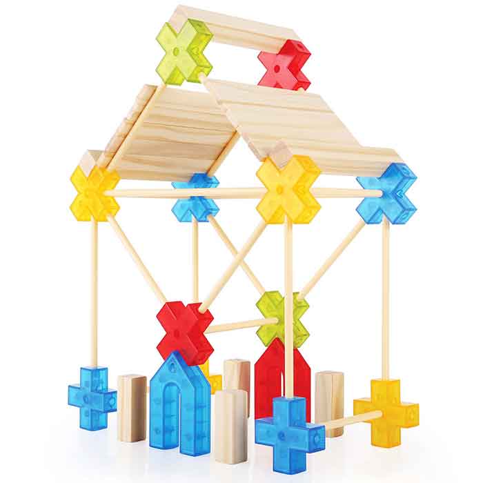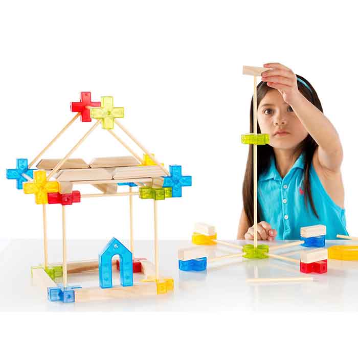 This classic open-ended construction toy introduces kids to a variety of design and building systems. Ideal for big-time collaborative building! Plastic rods, solid wood planks and geometric connectors fit together simply. Set includes 100 pieces and activity guide with easy step-by-step instructions.