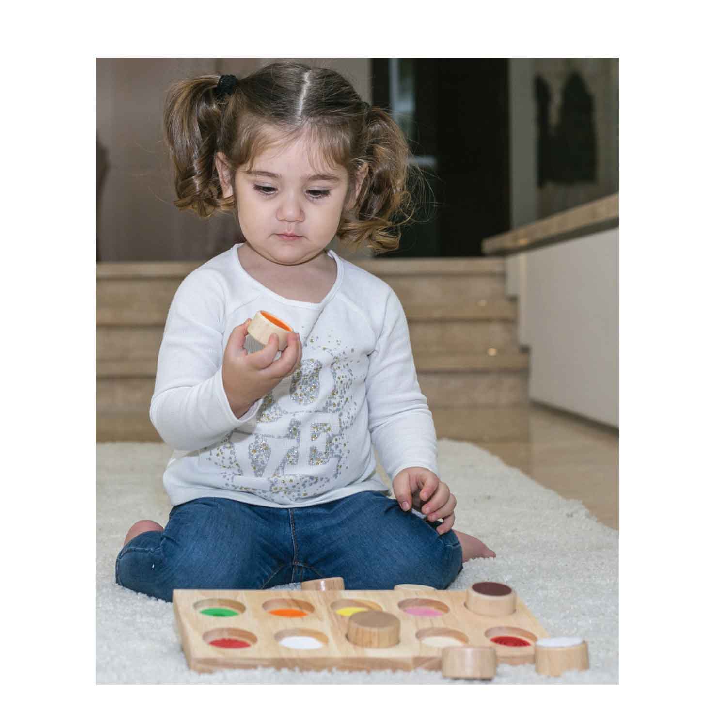 Identifying and remembering textures is an important part of sensory learning. In this memory game, children touch and name the colors and textures of the disks and then find the matching disc.