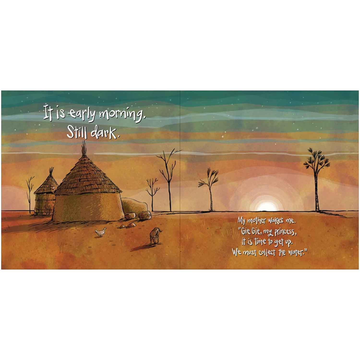 With its wide sky and warm earth, Princess Gie Gie’s kingdom is a beautiful land. But clean drinking water is scarce in her small African village. And try as she might, Gie Gie cannot bring the water closer; she cannot make it run clearer. Every morning, she rises before the sun to make the long journey to the well. Instead of a crown, she wears a heavy pot on her head to collect the water. After the voyage home, after boiling the water to drink and clean with, Gie Gie thinks of the trip that tomorrow will bring. And she dreams. She dreams of a day when her village will have cool, crystal-clear water of its own.