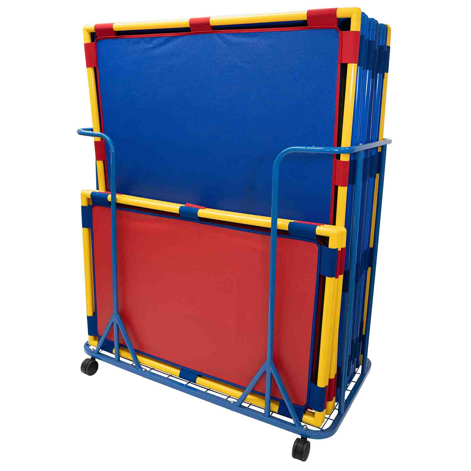This universal cart stores 40 (1") or 20 (2") rest mats, modular block sets, and more! Cart is powder coated, heavy-duty steel and wire frame construction and rolls easily on four 3” rubber casters (2 locking).