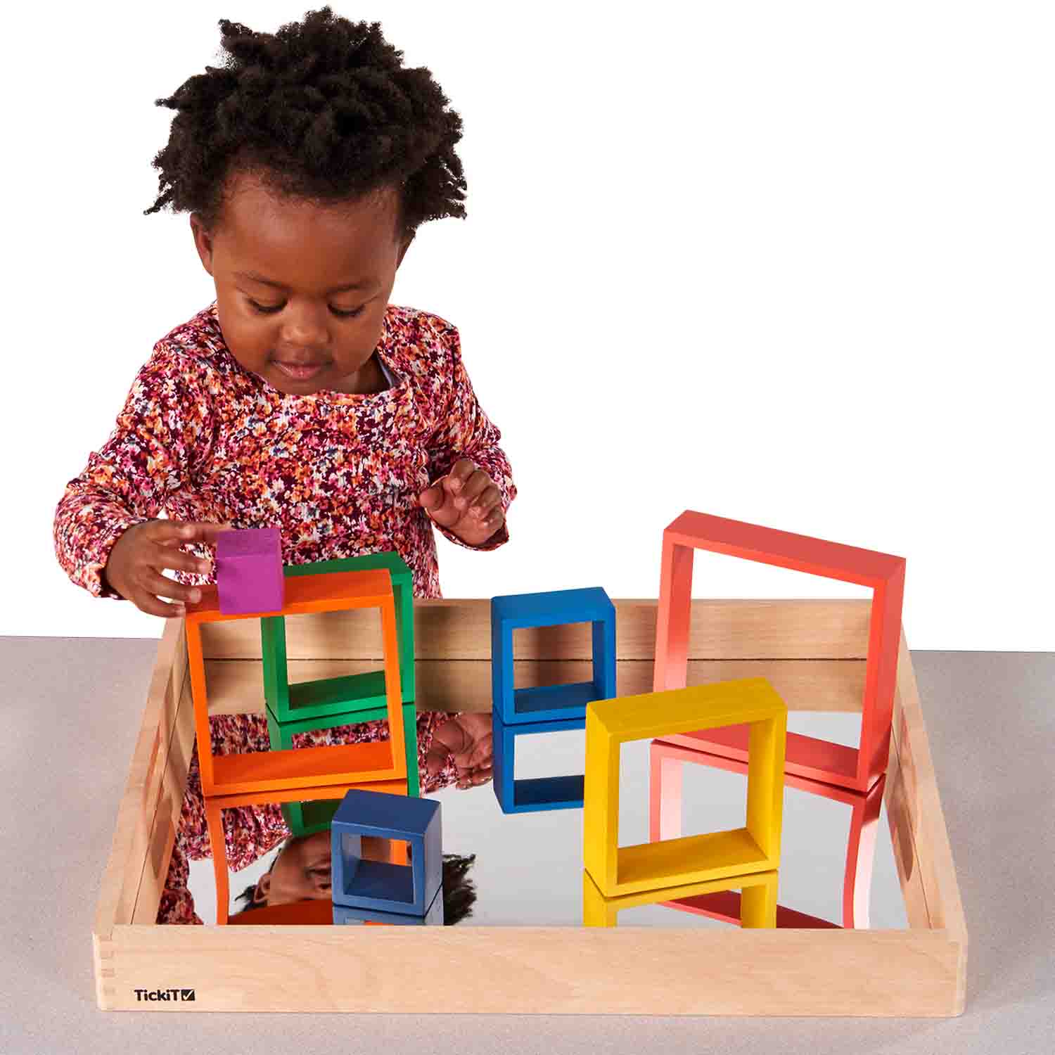 This solid beechwood mirror tray helps children learn about reflection and mirror effects. They can closely inspect objects or use in imaginative play to create small world environments. The acrylic mirrored base provides a sharp, clear reflection.