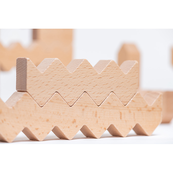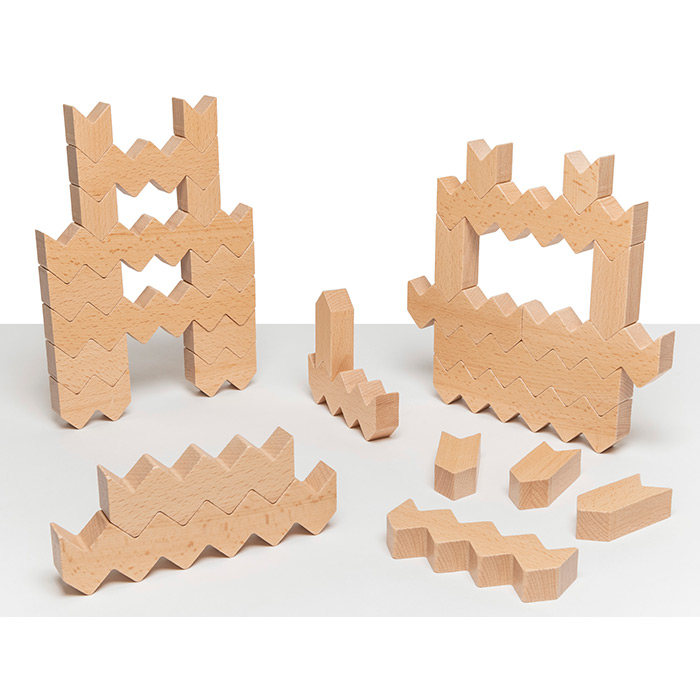 The Zig Zag Blocks Set features six pieces of each of the five different shapes, including a spacer piece for added height. This set encourages logical reasoning as children explore the best ways to stack and create their designs. The chunky pieces are designed for little hands, making them easy to grip and manipulate.